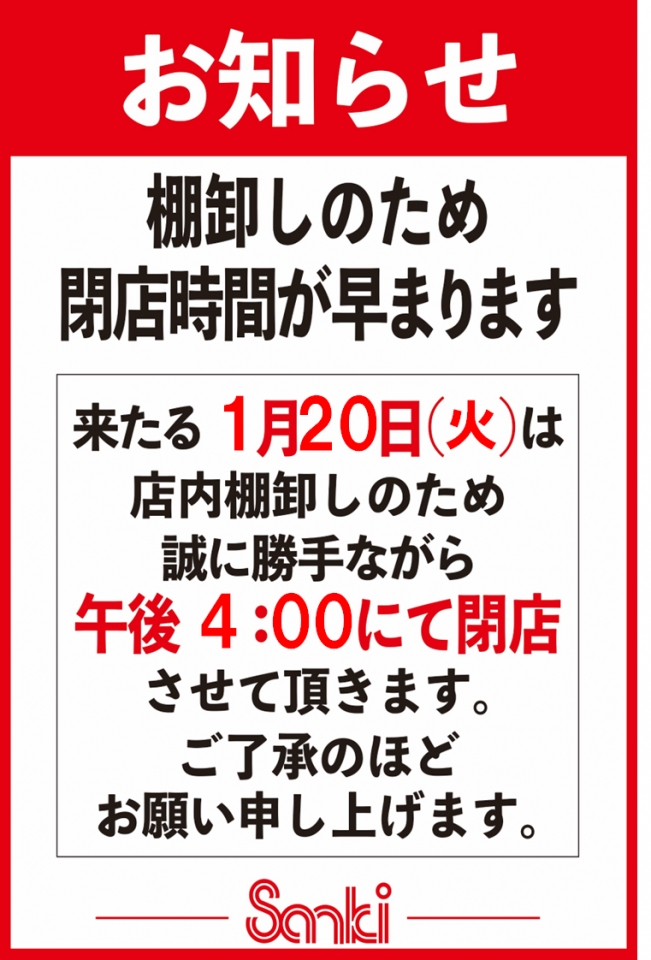 | 備 考 | ※冬季短縮営業のお知らせ※ 1月4日(日)~3月31日(火)まで 開店10:00~閉店18:30 とさせて頂きます 4月1日(水) 10:00~19:00 通常営業致します ご不便をお掛け致しますがご理解宜しくお願い致します ![]() |
